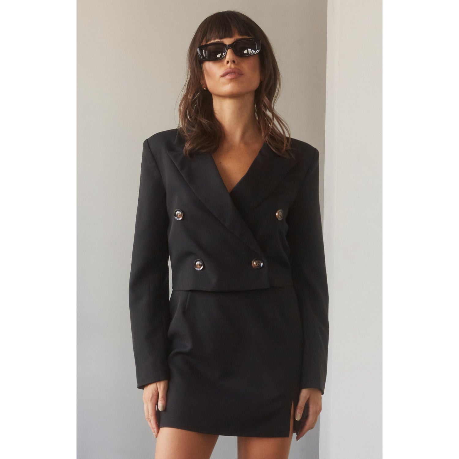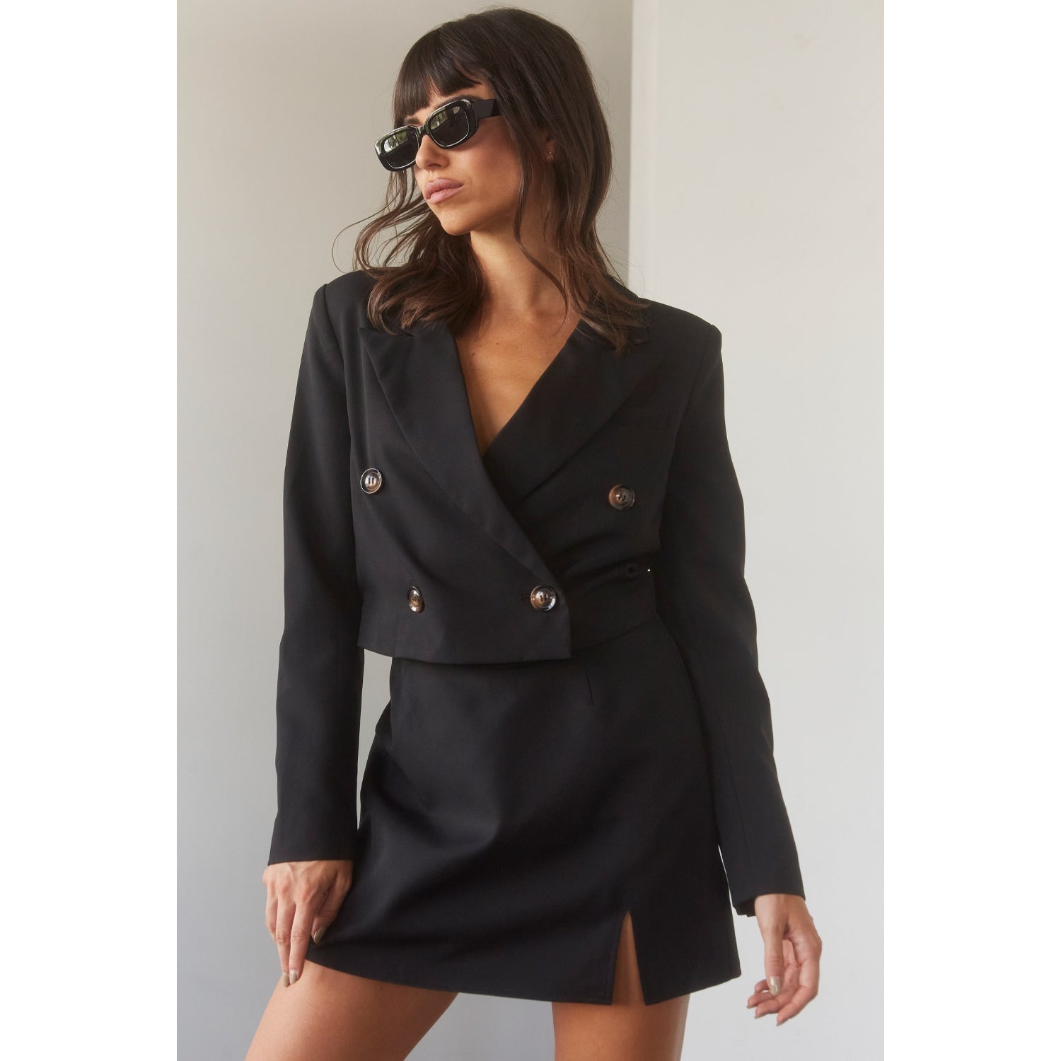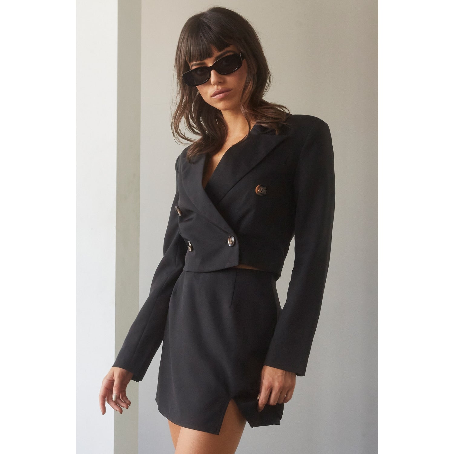 Cropped peak lapel blazer with single breasted front closure and inside button for security. Four brown marled buttons at front and slanted non functional pocket on left chest. Fully lined, padded shoulders, three non-functional buttons at sleeves. Short solid skirt with left leg side slit, fully lined, invisible zipper closure at back and 2 pleats at front and 2 pleats at back.