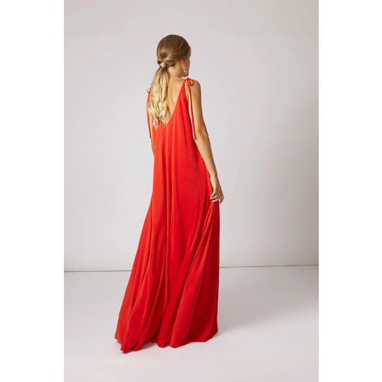 Maxi dress made with satin crepe with great fall and lots of movement. Suspenders made of the same fabric and adjustable so that each person can color them to their liking and size. V-neckline on both the front and back. One size fits all. Color: Red/ Scarlet. Composition: 100% polyester. Made in Spain